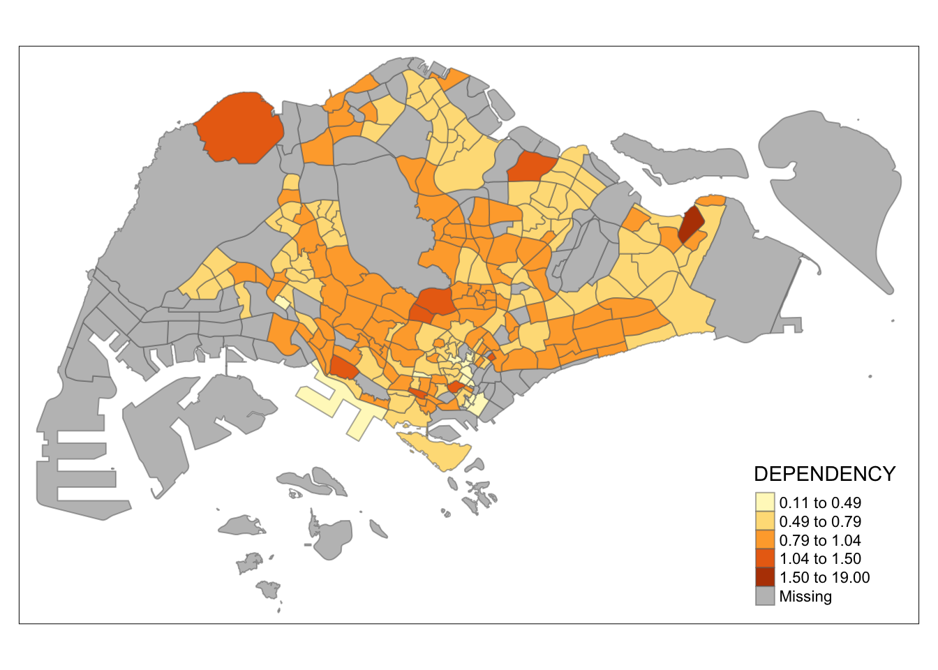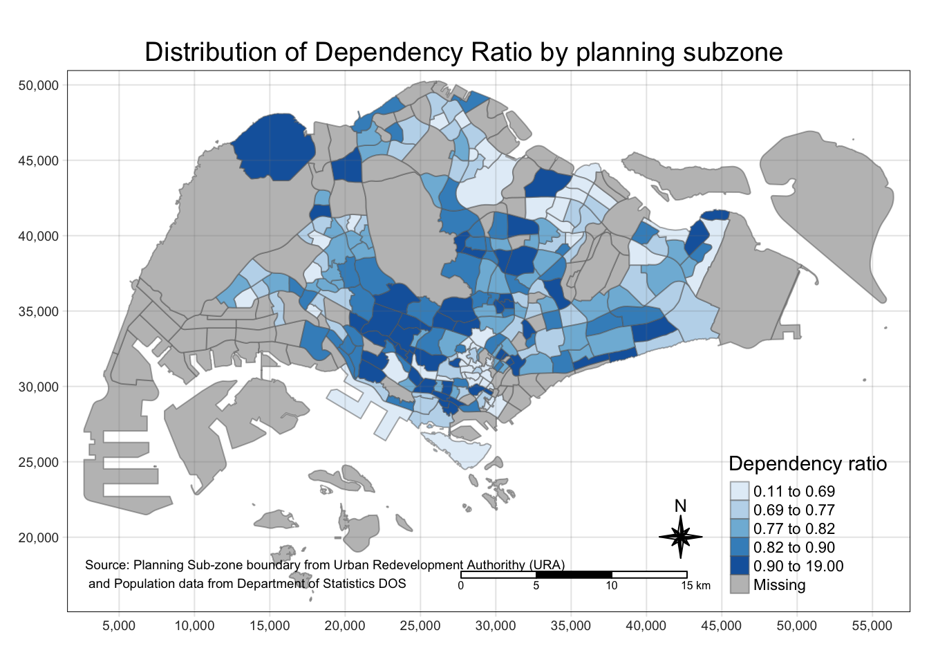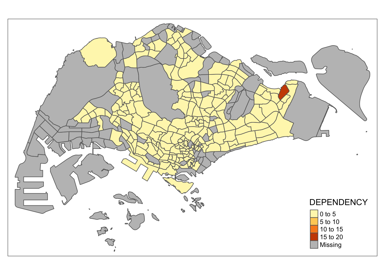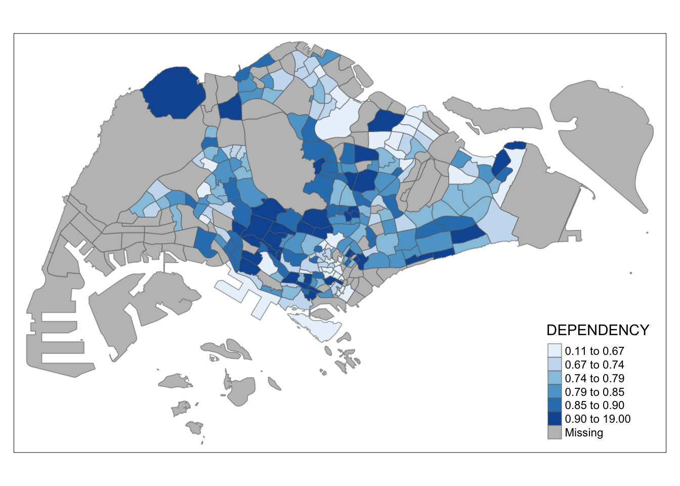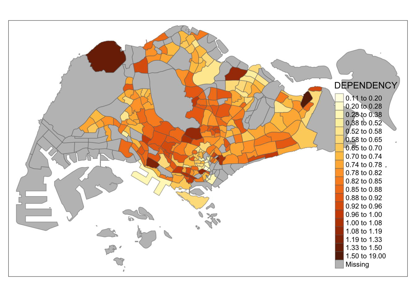 tm_layout(main.title = "Distribution of Dependency Ratio \nby planning subzone",