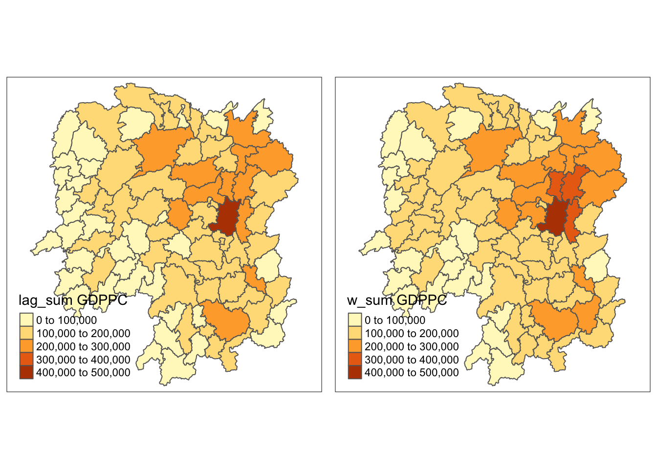 colnames(w_sum_gdppc.res) <- c("NAME_3", "w_sum GDPPC")Step 7: append w_sum GDPPC values into hunan sf data frame by using left_join()