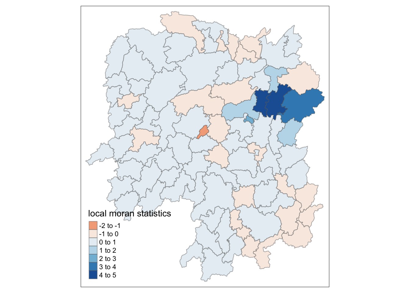 head(localMI) Ii E.Ii Var.Ii Z.Ii Pr(z != E(Ii))