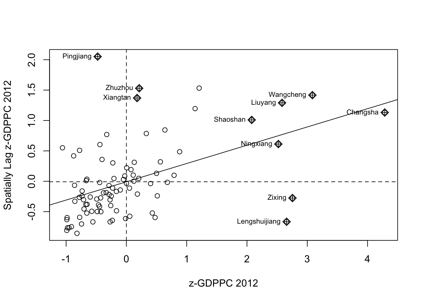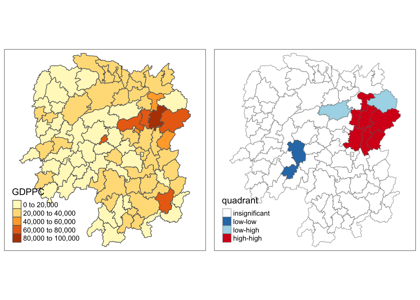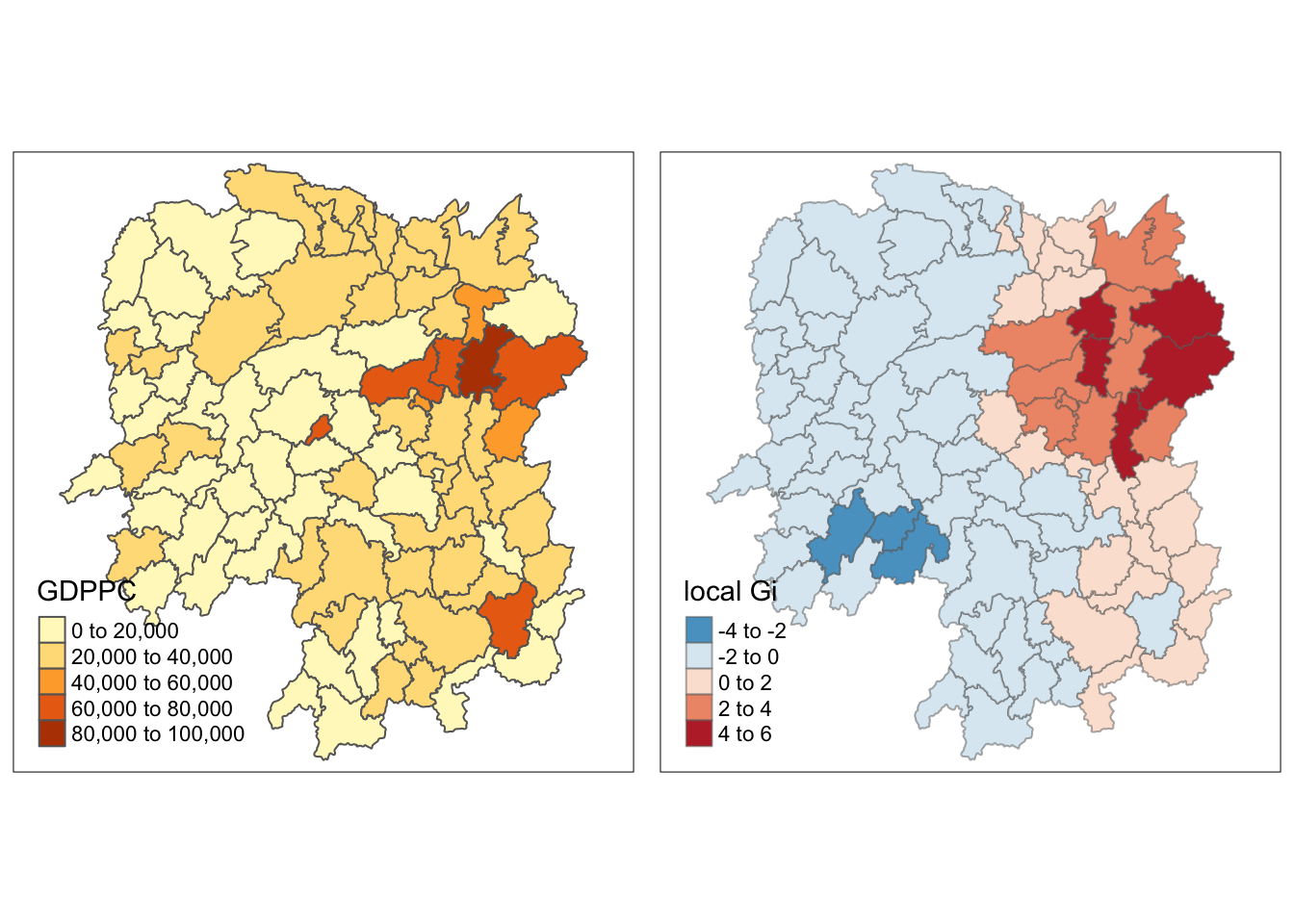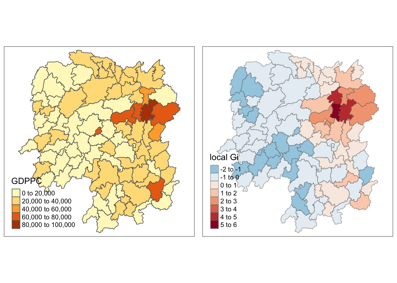 We will be applying local Moran’ I to detect cluster and/or outliers from GDP per capita 2012 of Hunan Province, PRC.