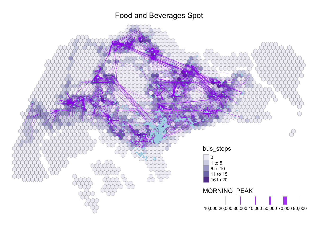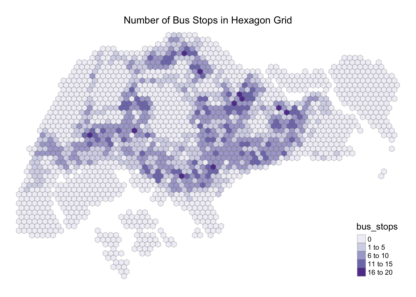 st_make_grid(): create a regular grid of spatial polygons. To reflect the distance from centre of the hexagon to its edge (375m), we will revise the cell width and height to c(750,750) to reflect the full diameter.st_sf(): convert the honeycomb grid object to an sf object. We used[mpsz$geometry]to identify hexagon grid that intersects.rowid_to_column(): add rowid as a column. Values in this column are the row IDs of each grid cell.lengths(st_intersects()): assigns the number of bus stops for each cell to a new column named ‘bus_stops’ in hex_grid.st_intersects()checks for intersections between two spatial objects.as.factor(): to coverts the ‘grid_id’ column from<int>to<fct>tmap_options(check.and.fix = TRUE): forcing the polygons to be closedtm_shape()+tm_polygons(): plot the honeycomb grid cells as polygons