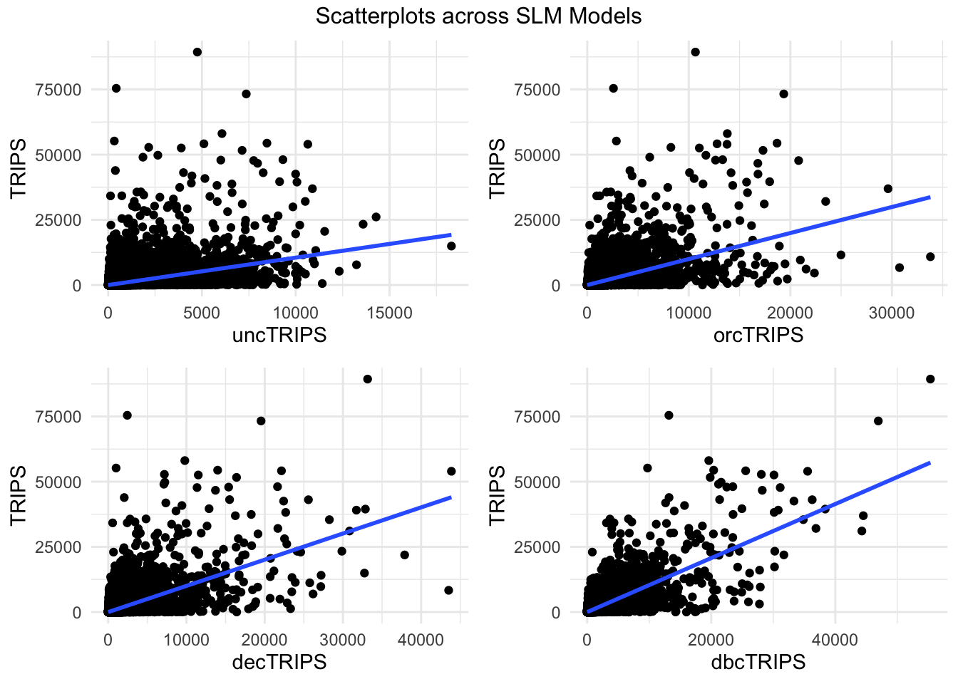 The plot above reveals that there are a few statistical outliers that have relatively frequent trips. The slope seems to be smoother for uncTRIPs, followed by orcTRIPs and gradually, become steeper. All of the models have positive correlation.