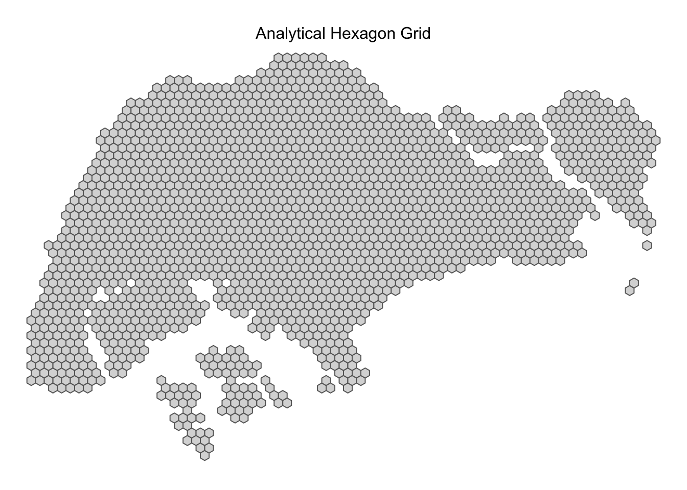 To get a better representative of the traffic analysis zone (TAZ), we will create an analytical hexagon grid. With reference from Urban Data Palette, we will used the code chunk below and execute in the following sequence: